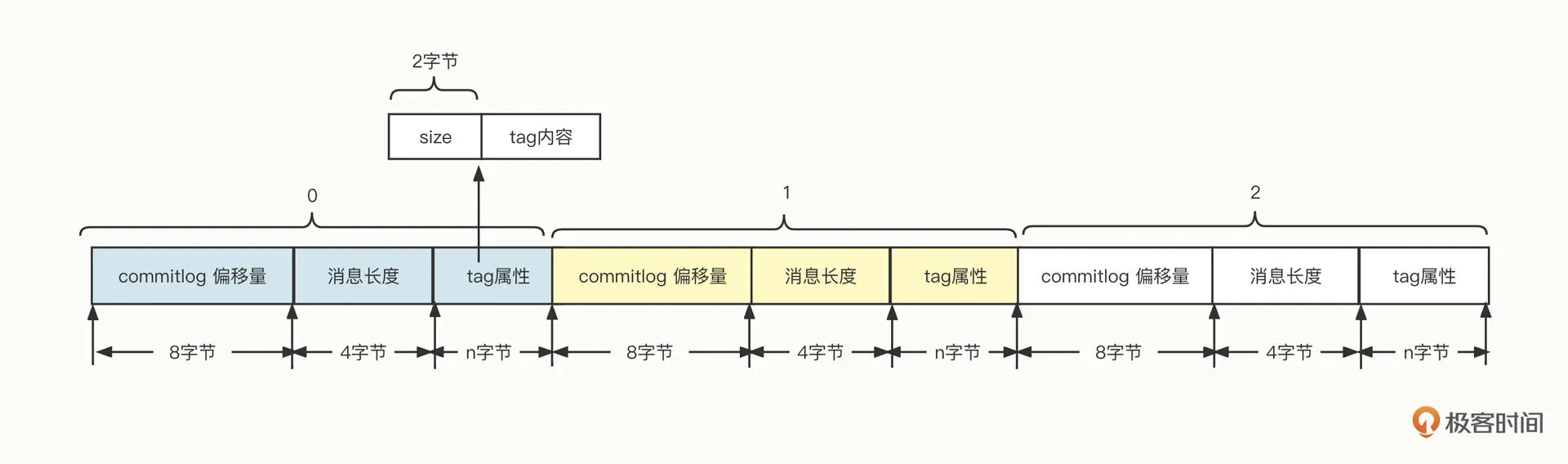 由于消息的 tag 是由用户定义的,例如 tagA、createorder 等,它的长度可变。在文件存储领域,一般存储可变长的数据,通常会采用“长度字段 + 具体内容”的存储方式。其中用来存储内容的长度使用固定长度,它是用来记录后边内容的长度。
