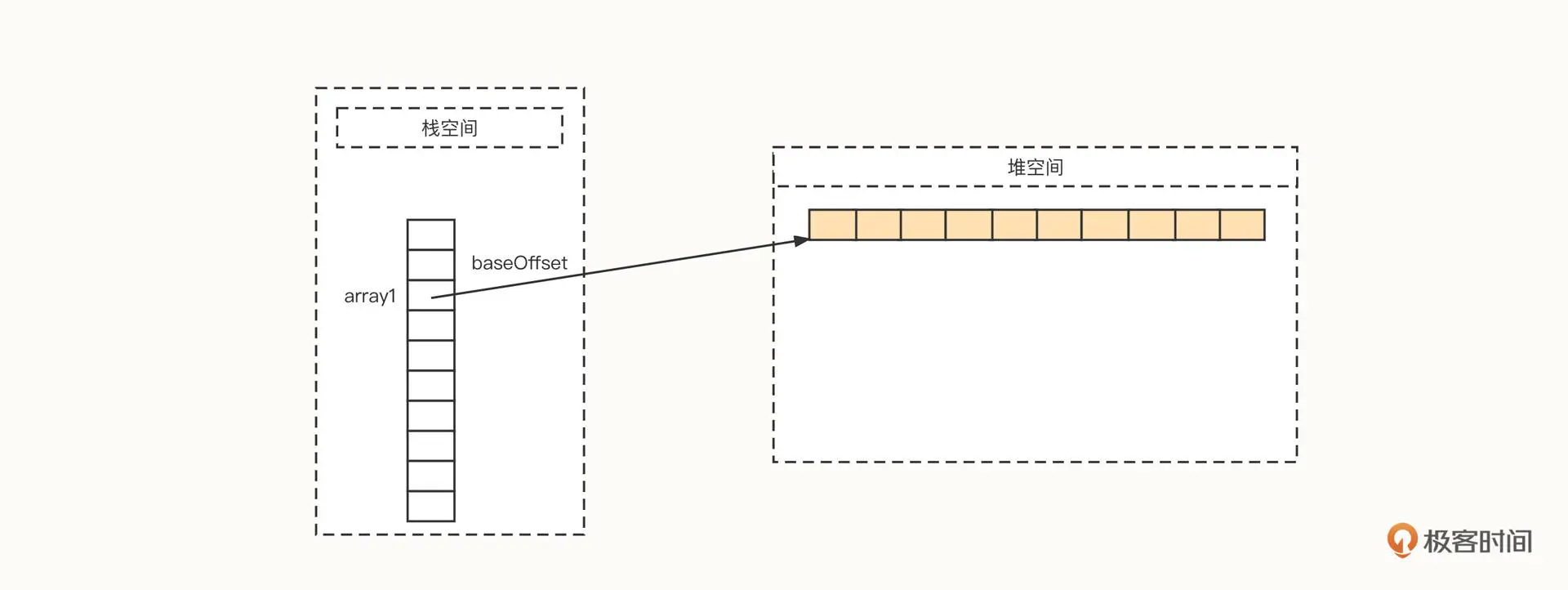 可以看到,首先内存管理器在栈空间会分配一段空间,用它存储数组在物理内存的起始地址,这个起始地址我们用 baseOffset 表示。如果是 64 位操作系统,默认一个变量使用 8 字节,如果采用了指针压缩技术,可以减少到 4 字节。