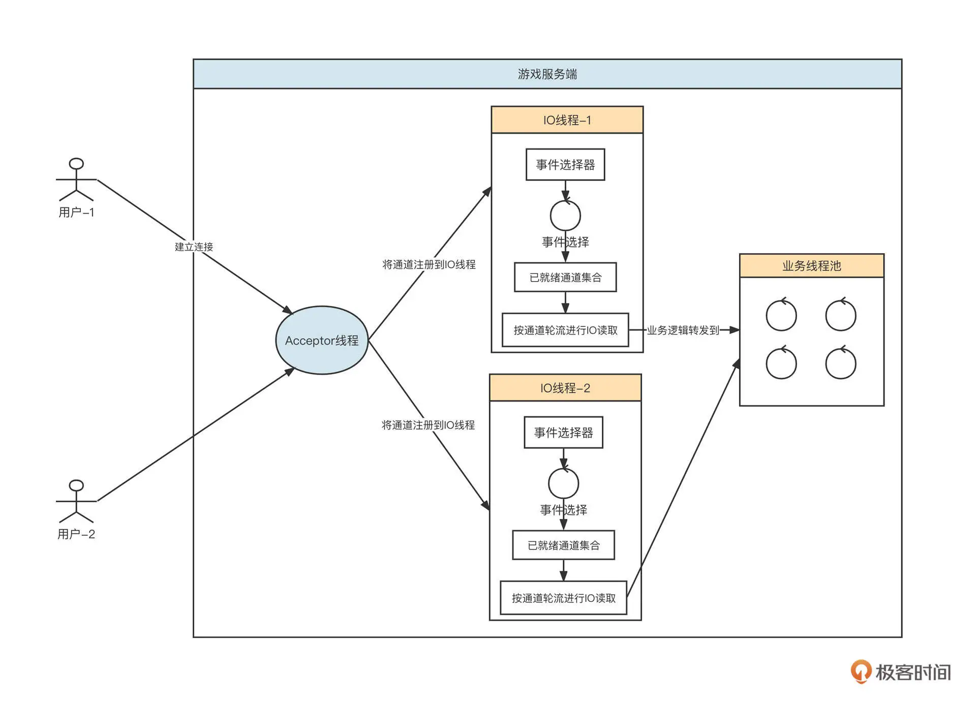首先,服务端会创建一个线程池专门处理网络读写,我们称之为 IO 线程池。IO 线程池内会内置 NIO 的事件选择器。当游戏服务端监听到一个客户端时,会从 IO 线程池中根据负载均衡算法选择一个 IO 线程,将其注册到事件选择器中。