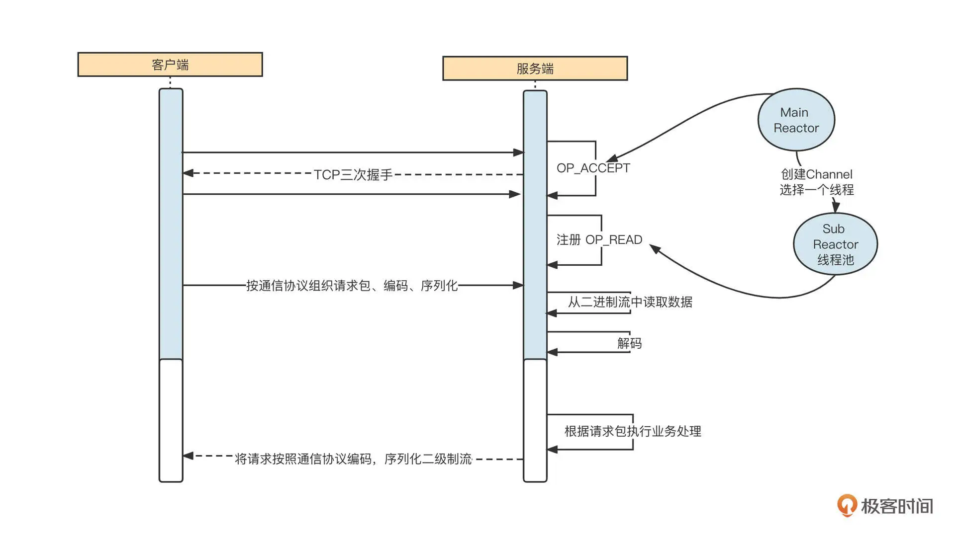 我们先来看一下 Reactor 模型的时序图,从全局把握整体脉络: