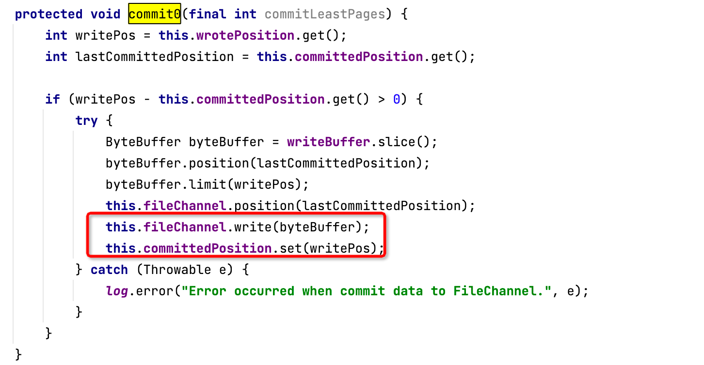 值得注意的是,RocketMQ 与 Kafka 都支持通过 FileChannel 方式写入,但 RocketMQ 基于 FileChannel 写入时,调用的 API 并不是 transferTo,而是先调用 writer,然后定时 flush 刷写到磁盘,具体调用入口为 MappedFile。代码截图如下: