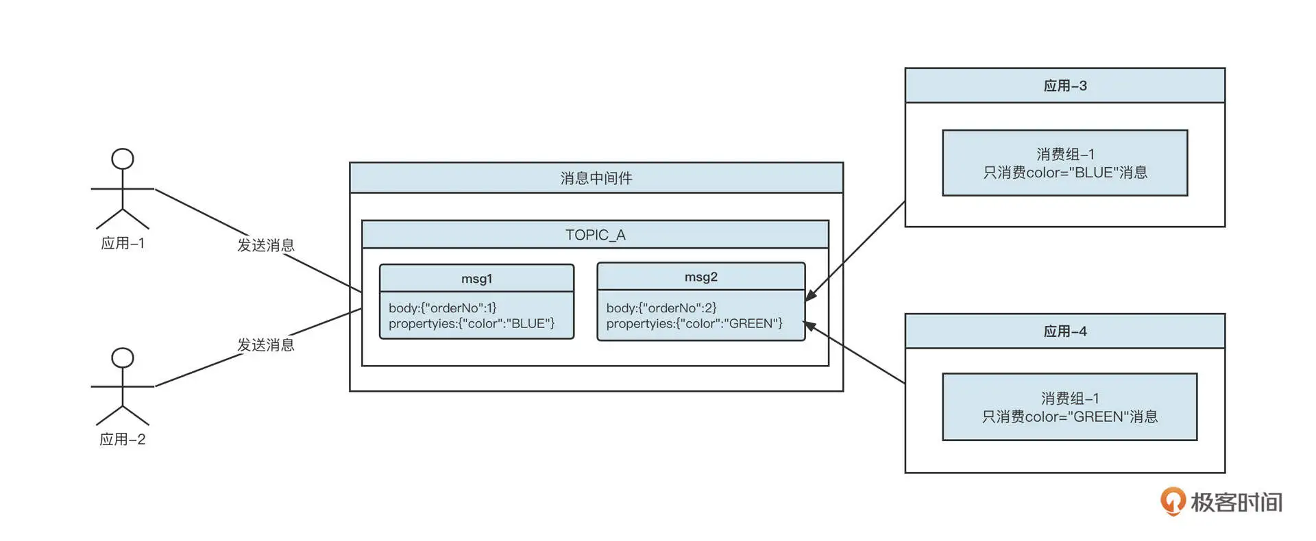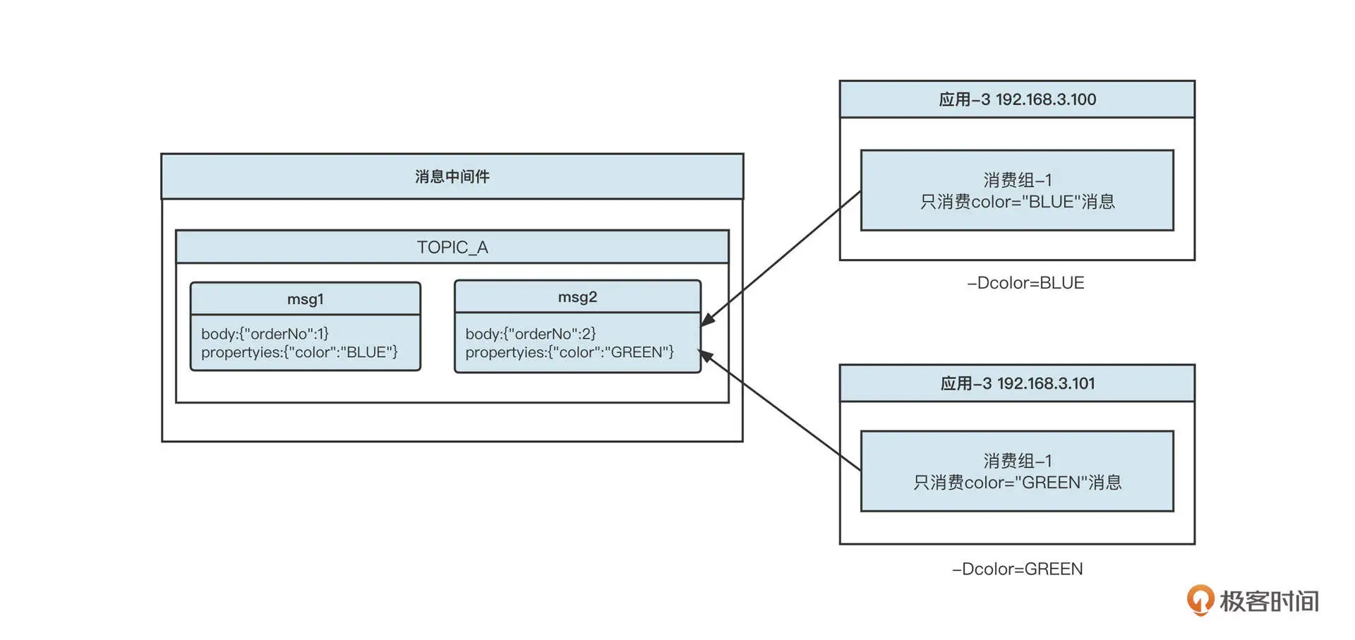 消息中间件中的另外一种隔离机制是基于消息属性的。例如,蓝绿两种颜色的消息使用的是同一个主题,但我们可以在消息中添加一个属性,标识这条消息的颜色。其存储示意图如下: