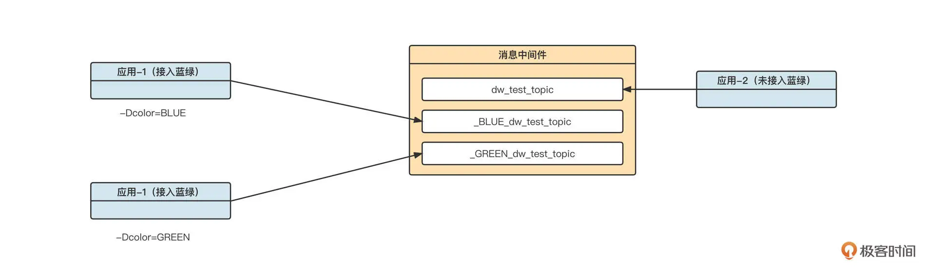 应用 2 不支持蓝绿发布,但同样需要在处理完业务后,向消息中间件中的 topic_A 发送消息。
