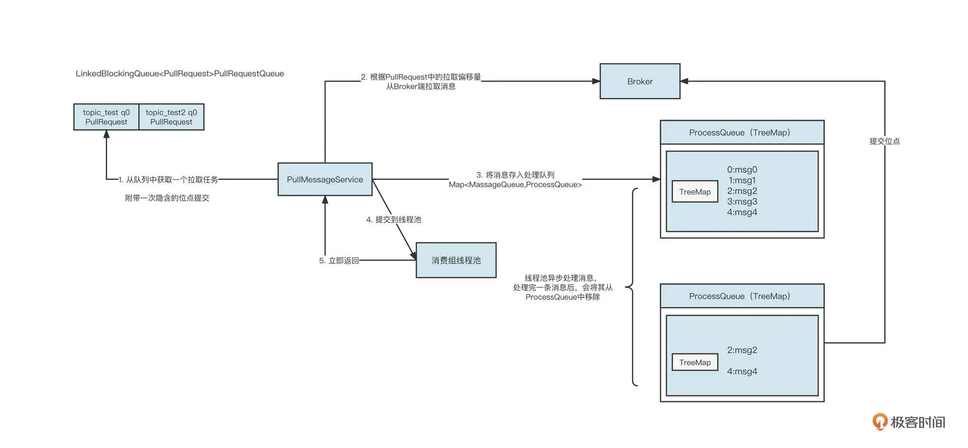 PullMessageService 线程将消息提交到线程池后,不会等这批消息处理完成,而是立即返回。然后 PullMessageService 线程重复步骤一到步骤五。