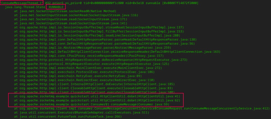在这个示例中,通过对线程栈的分析,我们发现是调用 HTTP 请求时没有设置超时时间,这就导致线程一直阻塞,对应的消息始终没有处理完成。消息一直在处理队列(ProcessQueue)中,而 RocketMQ 采取的又是最小位点提交机制,消费位点无法继续向前推进,这才出现了消费积压。