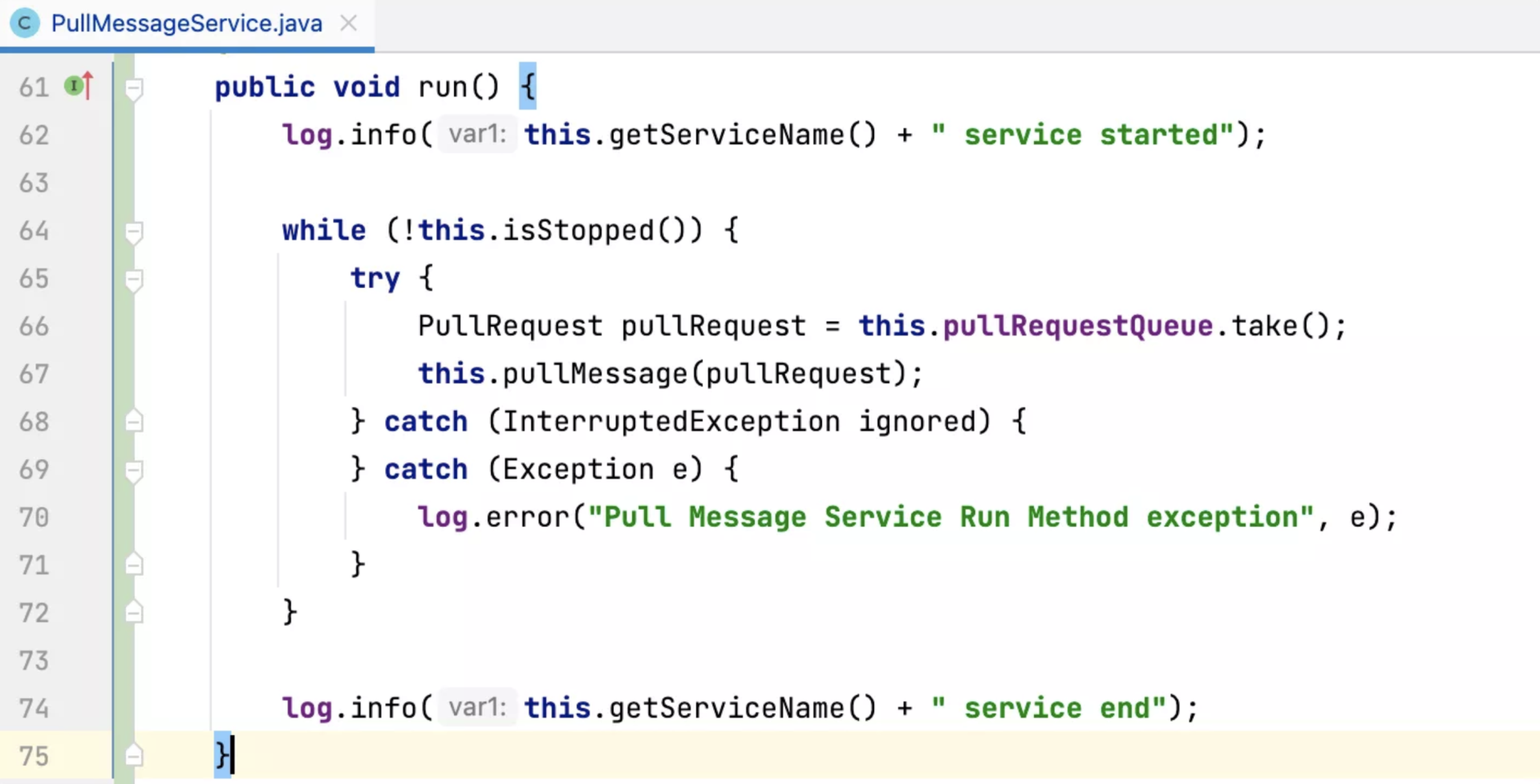 针对第一点,Pull 线程的 run 方法采用的是 while(true)+try catch 的模式,只要不主动关闭消费者,这个线程是不会停止的。具体的代码实现如下: