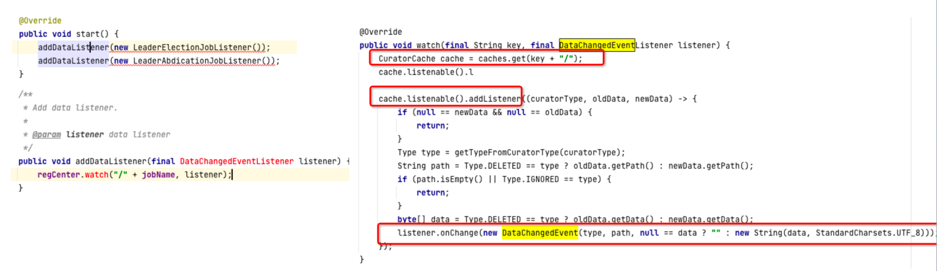 public static void addDataListener(String path, TreeCacheListener listener) { //注册事件监听