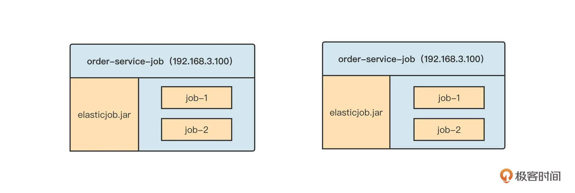 ElasticJob 的架构采取的是去中心化设计,也就是说,ElasticJob 在集群部署时,各个节点之间没有主从之分,它们的地位都是平等的。并且,ElasticJob 的调度侧重对数据进行分布式处理(也就是数据分片机制),在调度每一个任务之前需要先计算分片信息,然后才能下发给集群内的其他节点来执行。实际部署效果图如下: