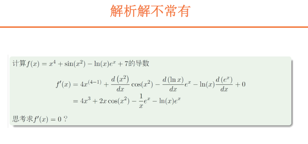 对于线性回归来说,我们可以求解出Beta的一个表达式,那样一个矩阵相乘,求逆,再进行相乘的一个表达式。很多时候,这个解析解我们求不到,求不到怎么办?就只能一点一点去试,一步一步去找,我要的最小值或者最大值,它到底在哪?这个时候就会用到我们最优化的方法,包括梯度下降,包括其他的一些方法。
