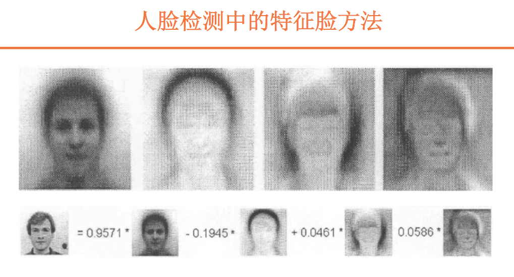这里面我也举一个例子,是人脸检测当中一个所谓的特征脸方法。特征脸的方法在人脸检测当中算是比较老的方法,在八九十年代就已经提出并且使用。而且相对于深度学习,或者基于神经网络的人脸检测的方法来说,它的效率,或者说准确率可能会稍微低一些,但是它比较能够说明线性代数的作用。