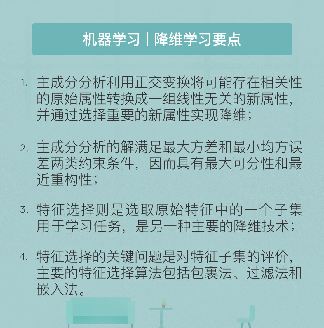 今天我和你分享了机器学习基本算法之一的主成分分析的基本原理,也介绍了另一种降维技术特征选择,其要点如下: