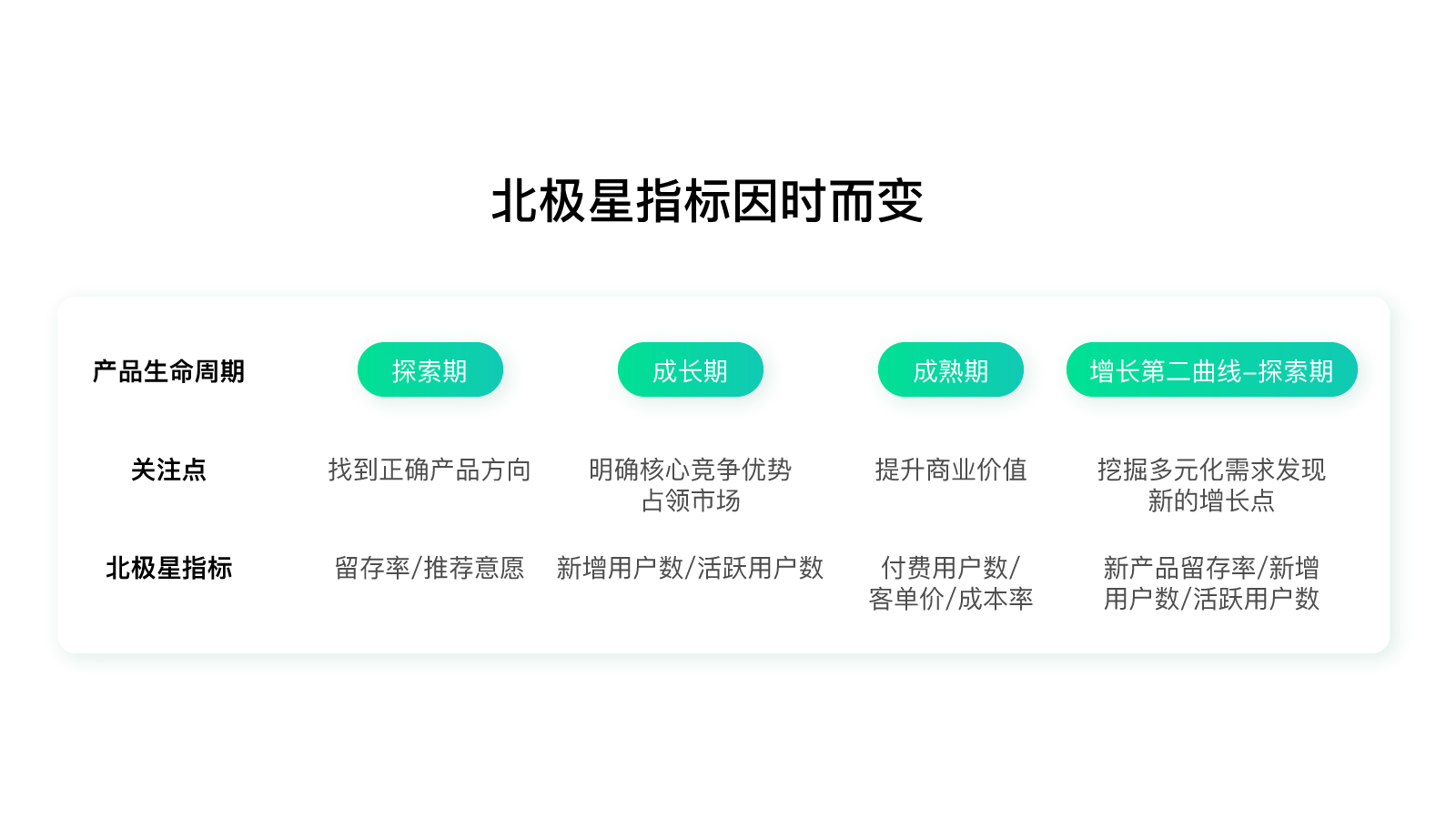 企业长远价值确实不会轻易改变,但在产品的不同生命周期,关注点是不同的,聚焦的指标自然也是不同的。