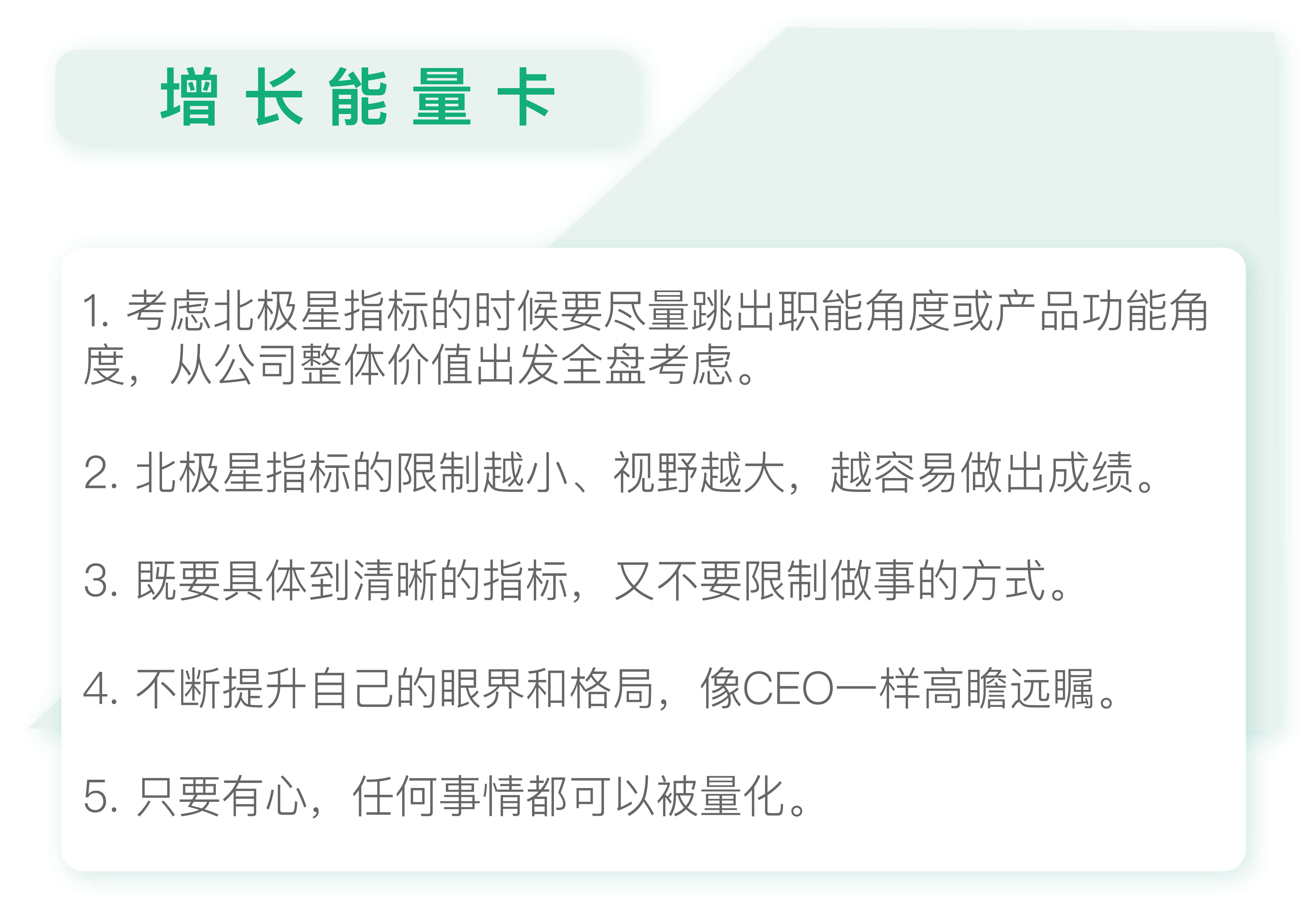 所以,在考虑北极星指标的时候,一定要从自己的职能角度跳出来,不要受角色的牵绊,要有意识地提升自己的认知维度,从整体价值出发全盘考虑。