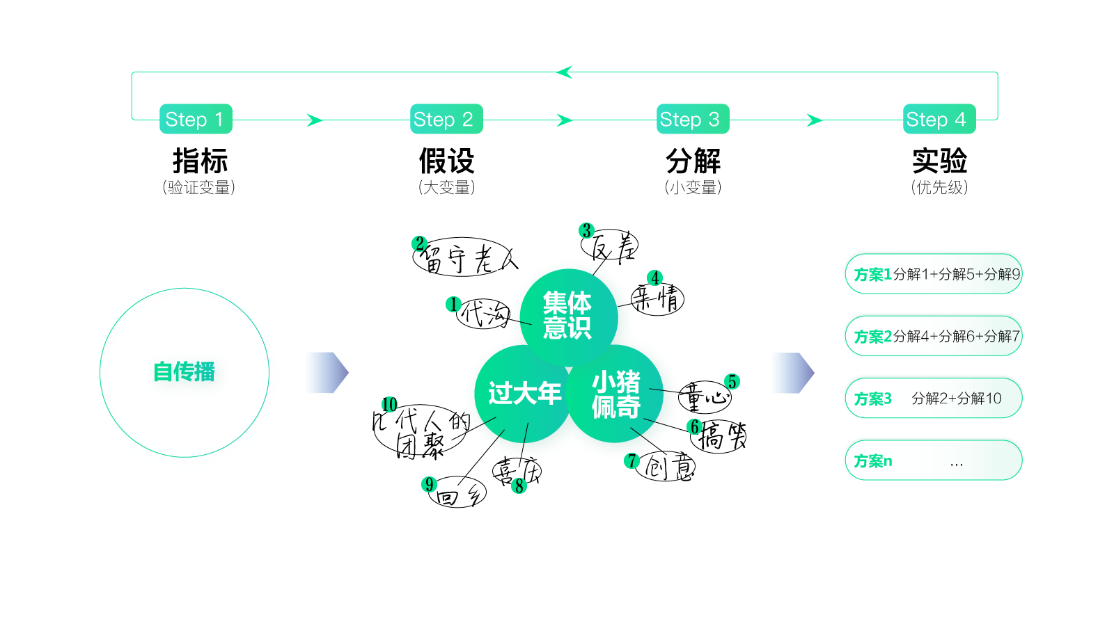 在这个过程中,你可以给每条分解都标个序号,通过各种组合,得到几个不同的序列组作为备选方案。看,这样就可以出多个创意方案了,是不是很有意思?