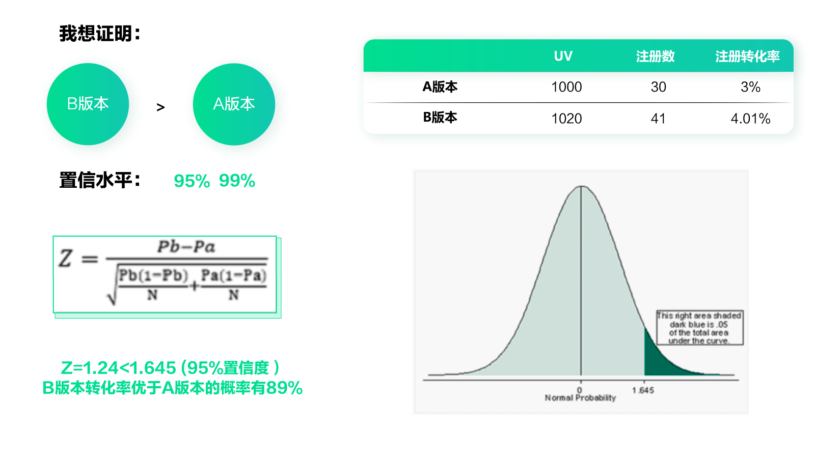 回到刚才那个例子,你只需要知道常用的置信水平是95%(也可以定为99%)。也就是说,如果我们能证明B版本比A版本好的概率在95%以上,就可以认为B版本更好了。