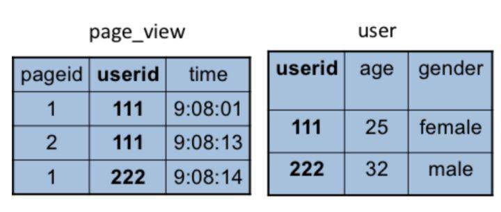 除了上面这些简单的聚合(group by)、过滤(where)操作,Hive还能执行连接(join on)操作。文章开头的例子中,pv_users表的数据在实际中是无法直接得到的,因为pageid数据来自用户访问日志,每个用户进行一次页面浏览,就会生成一条访问记录,保存在page_view表中。而age年龄信息则记录在用户表user中。