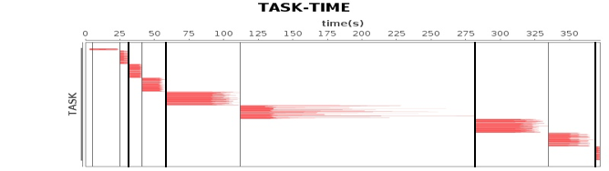 图中横轴方向是时间,纵轴方向是任务。两条粗黑线之间是一个作业,两条细线之间是一个计算阶段。一个作业至少包含一个计算阶段。水平方向红色的线是任务,每个阶段由很多个任务组成,这些任务组成一个任务集合。