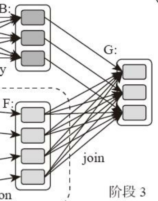 这里需要你特别注意的是,计算阶段划分的依据是shuffle,不是转换函数的类型,有的函数有时候有shuffle,有时候没有。比如上图例子中RDD B和RDD F进行join,得到RDD G,这里的RDD F需要进行shuffle,RDD B就不需要。