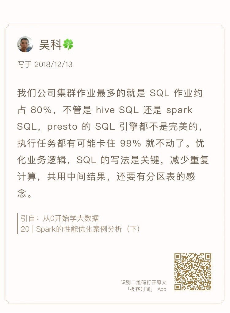 你好,我是李智慧,又到了我们模块答疑的时间了。在这个模块里,我主要讲了大数据开发的实践,所以今天我想和你聊聊我在大厂里学到哪些经验。