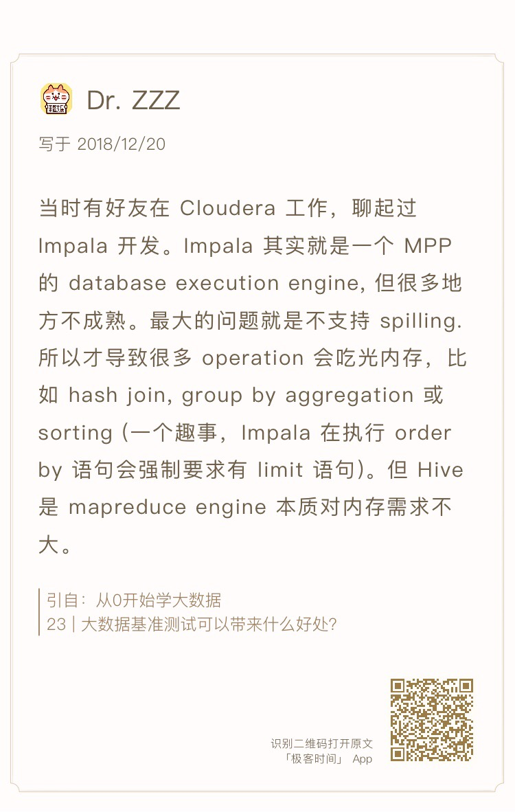 大数据实践的第三个层次是开发实践,大数据产品开发有两种,一种是重新开发,比如前面讲过的Doris、Dew,自己从头设计开发一个大数据系统,这样对学习的好处是可以更深刻、更全面理解大数据。另一种就是参与开源大数据产品的开发,比如前面讲过的Spark源码优化,这样的好处是可以和全世界最顶级的工程师一起讨论问题,通过交流学习提高。我在参与Spark开发的时候,跟Databricks、Cloudera的工程师交流,这些人可能是大数据技术领域最顶级的工程师,跟他们交流收获最深刻的不是技术,而是对他们技术水平的判断,以及进而对自己技术水平的判断,并因此促使自己思考自己未来的技术发展之路与人生之路。