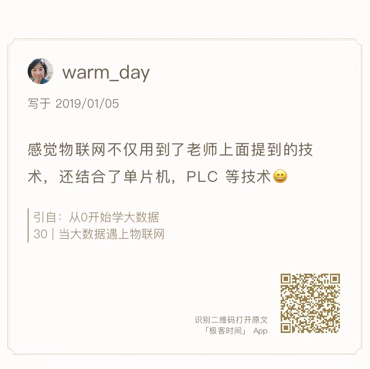 我的专栏的名字叫《从0开始学大数据》,确实不需要你有任何大数据背景就可以跟着专栏开始学习大数据,但是我并不希望你学完专栏后,还只是打了一个大数据的基础,我更希望你能掌握构建大数据系统大厦的能力。这当然会有难度,学习过程中也会有挫折感,但是我依然希望你能坚持学习,即使有些技术不能完全掌握,但是至少可以让你的视野达到一个更高的高度,去感受架构师如何思考架构设计,并可以把收获应用到未来的学习工作中,让自己有不断进步的目标和动力。