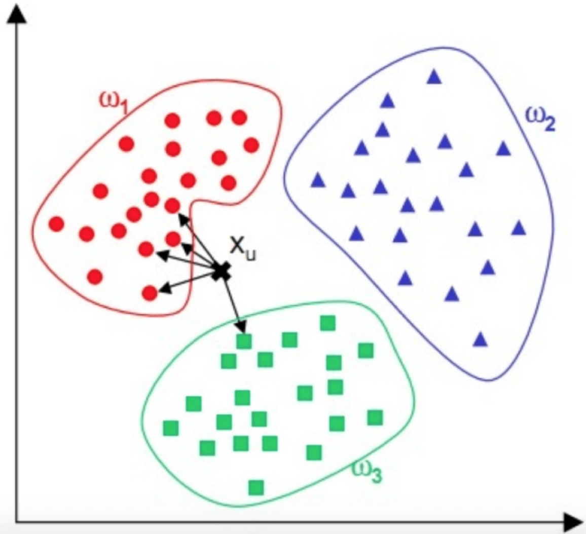 图中,红蓝绿三种颜色的点为样本数据,分属三种类别\(w\_{1}\)、\(w\_{2}\)、 \(w\_{3}\) 。对于待分类点\(X\_{u}\) ,计算和它距离最近的5个点(即K为5),这5个点最多归属的类别为\(w\_{1}\)(4个点归属\(w\_{1}\),1个点归属\(w\_{3}\)),那么\(X\_{u}\)的类别被分类为\(w\_{1}\)。