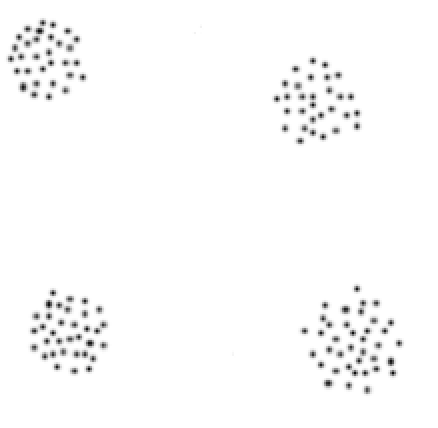聚类就是对一批数据进行自动归类,如下图这样的一组数据,人眼一眼就可以识别出可以分为四组。
