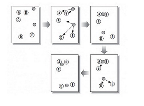 第2步:求图中所有点到这K个种子点的距离,假如一个点离种子点X最近,那么这个点属于X点群。在图中,可以看到A、B属于上方的种子点,C、D、E属于中部的种子点。