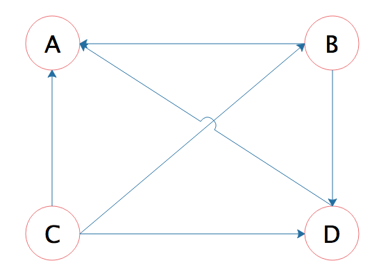 答案是Google使用了一种叫PageRank的算法,这种算法根据网页的链接关系给网页打分。如果一个网页A,包含另一个网页B的超链接,那么就认为A网页给B网页投了一票,以下面四个网页A、B、C、D举例,带箭头的线条表示链接。