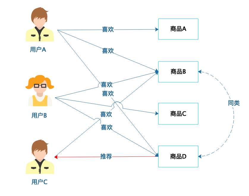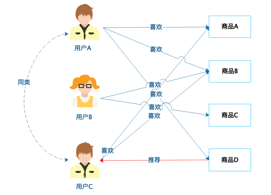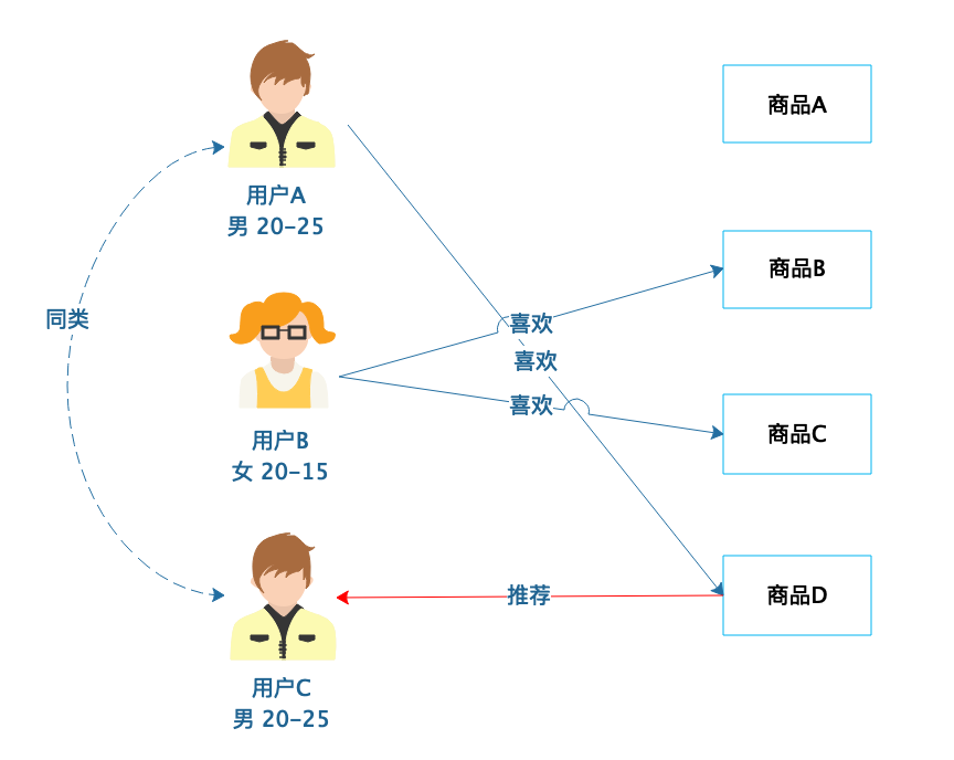 从图中可以看到,用户A喜欢商品A、商品B和商品D,用户C喜欢商品A和商品B,那么用户A和用户C就有相似的喜好,可以归为一类,然后将用户A喜欢的商品D推荐给用户C。