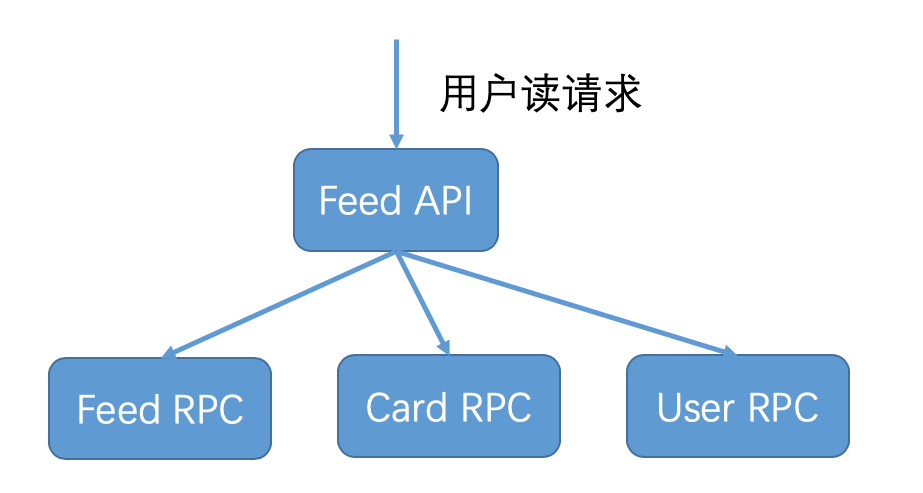 基于RPC通信的微服务架构,其特点是一个服务依赖于其他服务返回的结果,只有依赖服务执行成功并返回后,这个服务才算调用成功。这种架构适用于用户请求是读请求的情况,就像下图所描述的那样,比如微博用户的一次Feed API请求,会调用Feed RPC获取关注人微博,调用Card RPC获取微博中的视频、文章等多媒体卡片信息,还会调用User RPC获取关注人的昵称和粉丝数等个人详细信息,只有在这些信息都获取成功后,这次用户的Feed API请求才算调用成功。