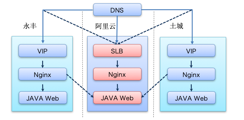 当有流量上涨,超出了内部私有云机房部署所能承受的范围时,可以扩容阿里云机房的机器,然后把流量切换到阿里云机房,这个过程请看下面这张图。切流量也有两种方案:一是在DNS层切换,把原先解析到私有云机房VIP的流量,解析到阿里云机房的SLB,这时候阿里云机房部署的SLB、Nginx和Java Web都需要扩容;一种是在Nginx层切换,把原先转发到私有云机房Nginx的流量,转发到阿里云机房的Java Web,这个时候只需要扩容阿里云的Java Web。