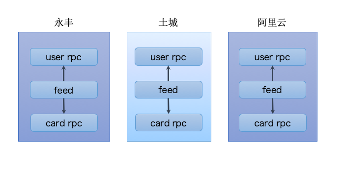 在进行服务编排时,如果服务跨云部署,就要考虑跨机房访问的问题了。就像下图所描述的那样,微博的Feed服务不仅依赖User RPC,还依赖Card RPC,这样的话如果Feed服务需要扩容的话,就需要先扩容User RPC和Card RPC。由于Feed服务在永丰、土城、阿里云三个机房内都有部署,任意一个机房内部署的Feed服务需要扩容时,就需要扩容同一个机房内的User RPC和Card RPC。