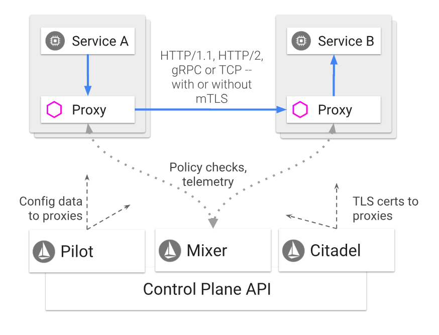 Control Plane,与Proxy通信,来实现各种服务治理功能,包括三个基本组件:Pilot、Mixer以及Citadel。