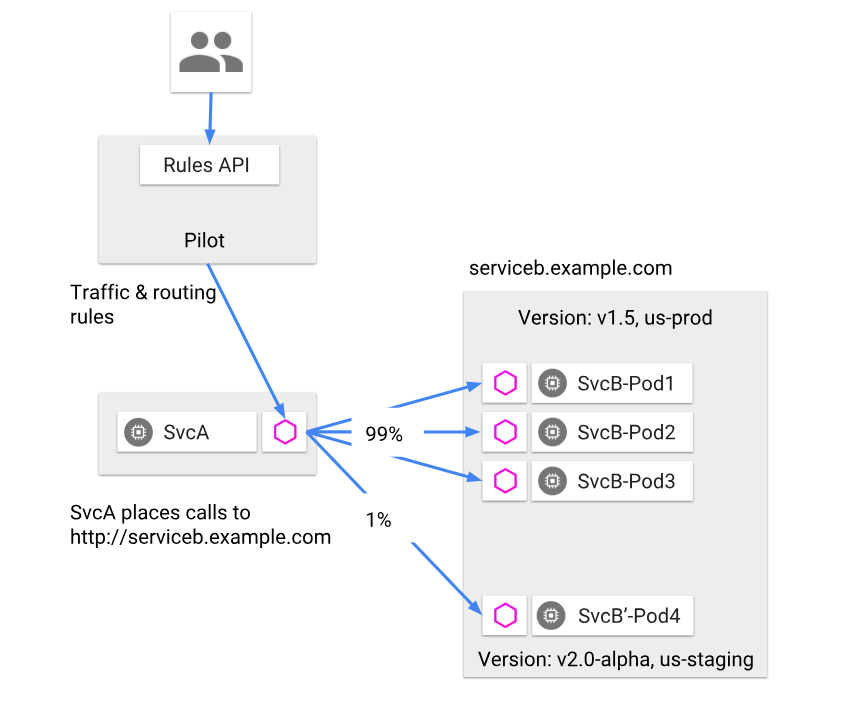 Pilot可以对服务进行版本和环境的细分,服务B包含两个版本v1.5和v2.0-alpha,其中v1.5是生产环境运行的版本,而v2.0-alpha是灰度环境运行的版本。当需要做A/B测试时,希望灰度服务B的1%流量运行v2.0-alpha版本,就可以通过调用Pilot提供的Rules API,Pilot就会向Proxy下发路由规则,Proxy在转发请求时就按照给定的路由规则,把1%的流量转发给服务B的v2.0-alpha版本,99%的流量转发给服务B的v1.5版本。