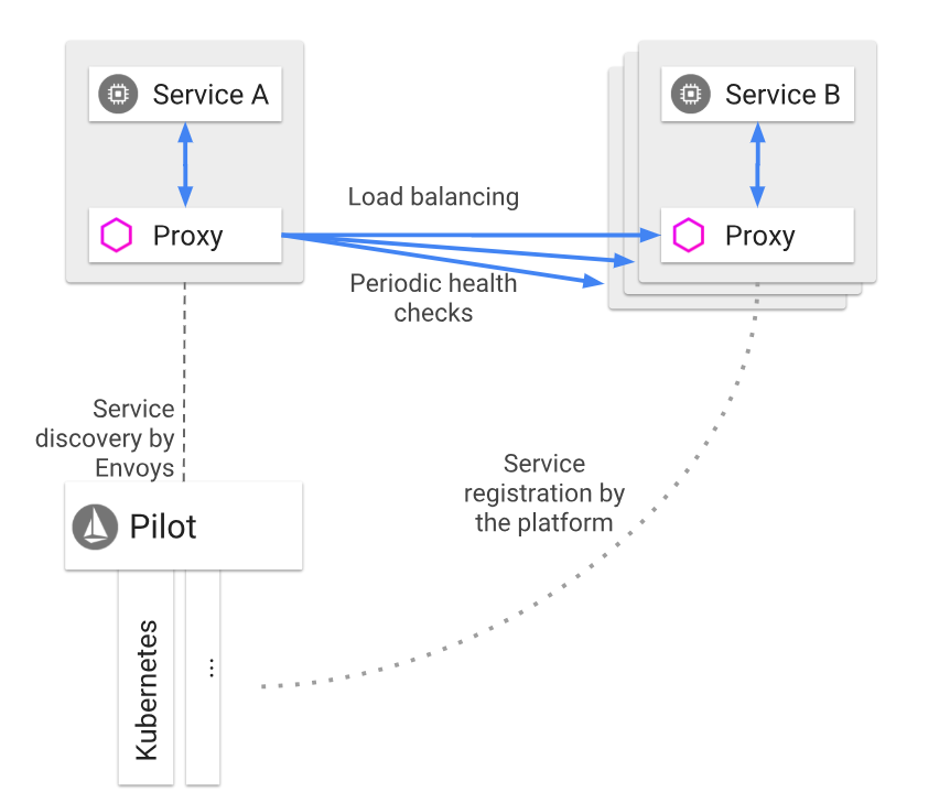 就像下图所描述的那样,服务B也就是服务提供者注册到对应平台的注册中心中去,比如Kubernetes集群中的Pod,启动时会注册到注册中心etcd中。然后服务A也就是服务消费者在调用服务B时,请求会被Proxy拦截,然后Proxy会调用Pilot查询可用的服务提供者节点,再以某种负载均衡算法选择一个节点发起调用。