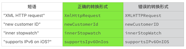 下面的表格列出了不同例子的正确转换形式,和容易出错的转换形式 (出自“Google Java Style Guide”)。