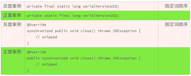 Java的语法中,限定词的使用顺序没有强制性规定。但是,限定词的使用顺序有一个约定俗成的规则。按照这个规则使用限定词,一般来说,我们最关切的修饰符最先进入我们的视野,和标识符最密切的位置最靠近标识符。使用一致性的顺序,我们就能更快速地理解一个声明。