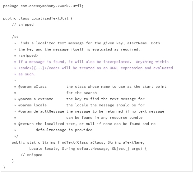对于LocalizedTextUtil.findText()的规范,我们要留意蓝色字体的部分。这一部分告诉我们,如果信息里包含了OGNL(Object Graph Navigation Language)的表达式,表达式会被执行。