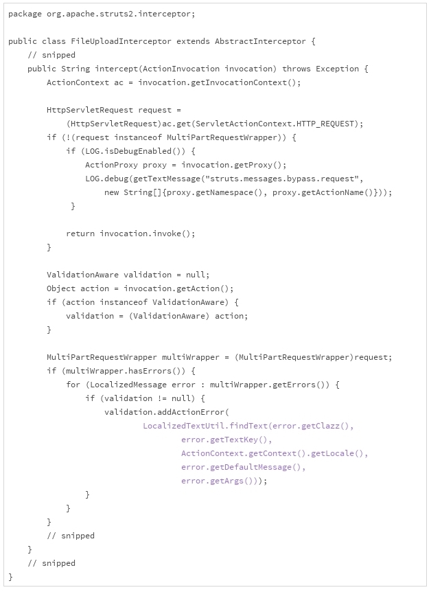 Web服务器接收后,会解析这段请求,然后执行相关的操作。下面的这段代码,是2017年3月之前Apache Struts 2解析“multipart”请求的实现。