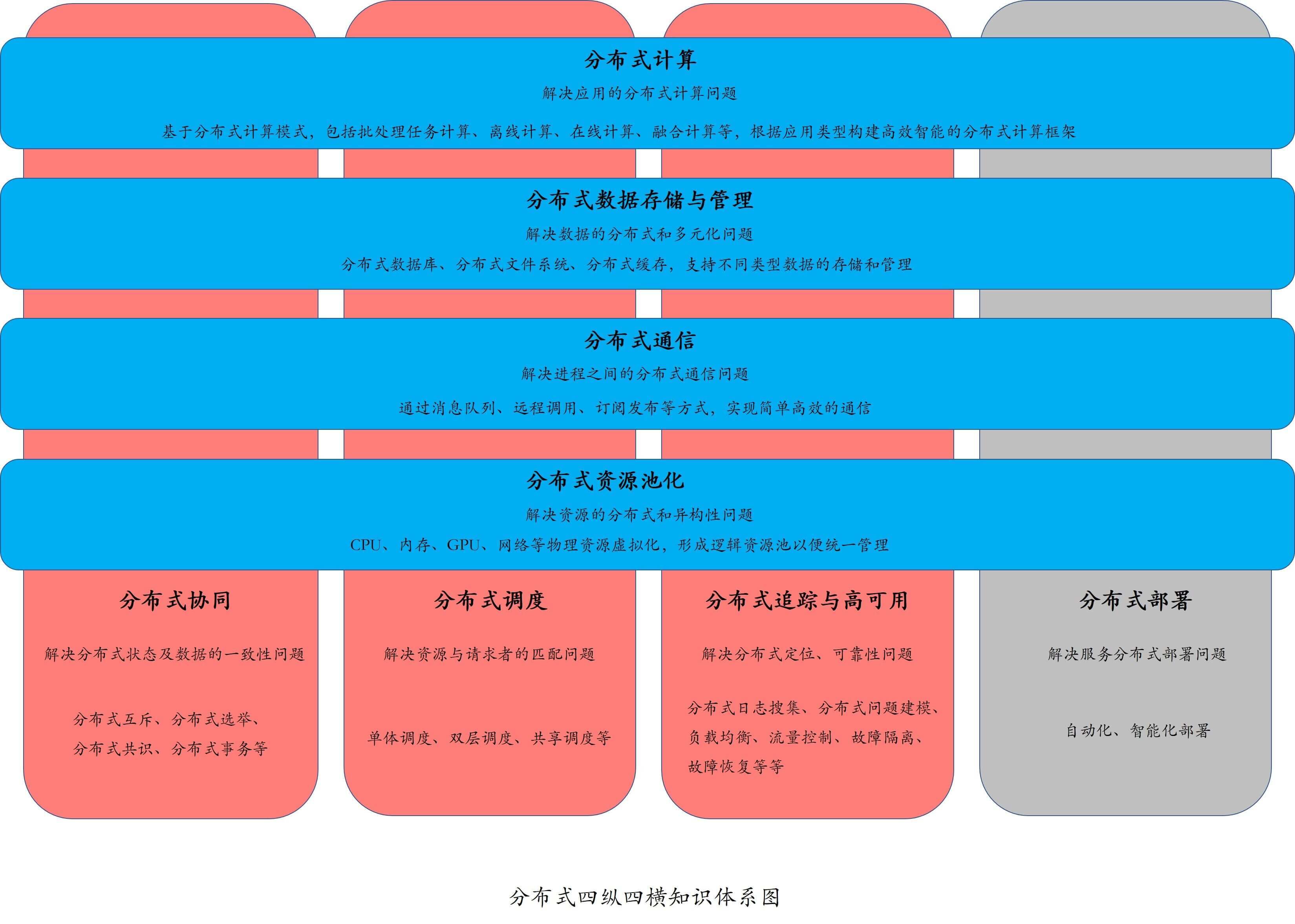 既然横向的4个层次都已经完备了,那为什么又多出了4个纵向的技术呢?如果我们把横向的4个层次比作派生类的话,那么纵向的4条技术线应该是它们的基类。因为,在分布式环境下,无论是资源、通信、数据还是计算,都需要去解决协同、调度、追踪高可用,还有部署的问题。因此,我从横向的技术层次中,提炼出分布式协同、分布式调度、分布式追踪与高可用、分布式部署4个纵向技术线。由于分布式追踪、分布式部署虽属于支撑技术,但并不会影响业务的构成,因此我不会在本专栏中进行讲解。