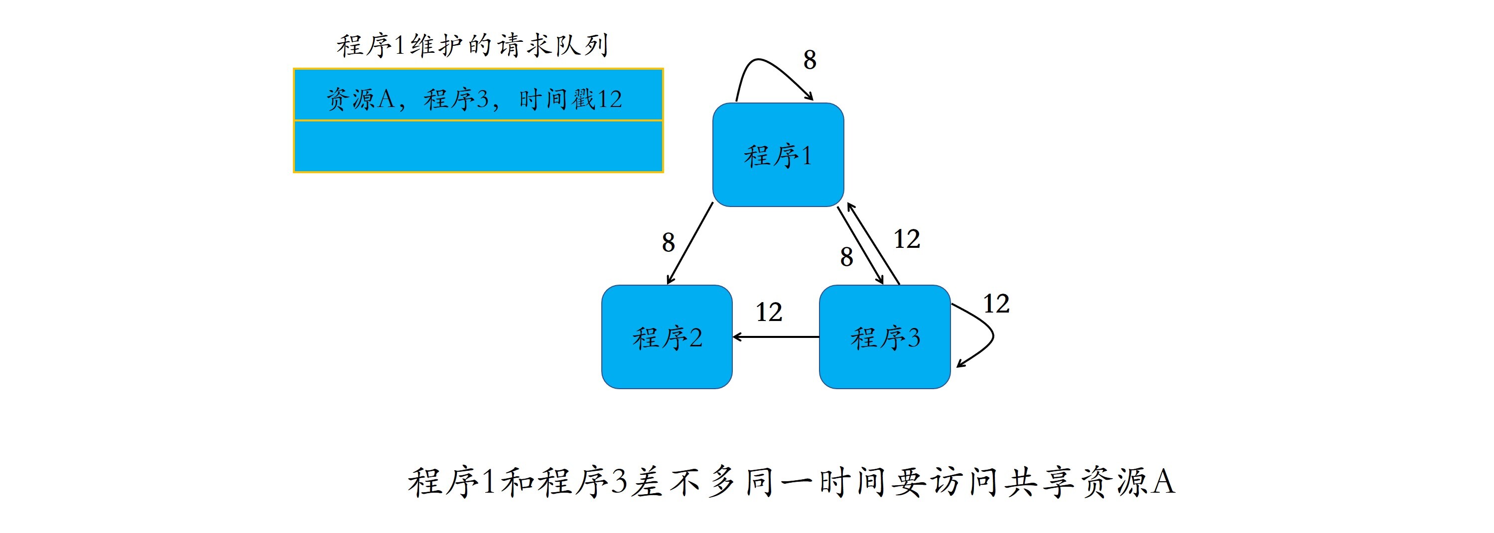 如图所示,程序1、2、3需要访问共享资源A。在时间戳为8的时刻,程序1想要使用资源A,于是向程序2和3发起使用资源A的申请,希望得到它们的同意。在时间戳为12的时刻,程序3想要使用资源A,于是向程序1和2发起访问资源A的请求。