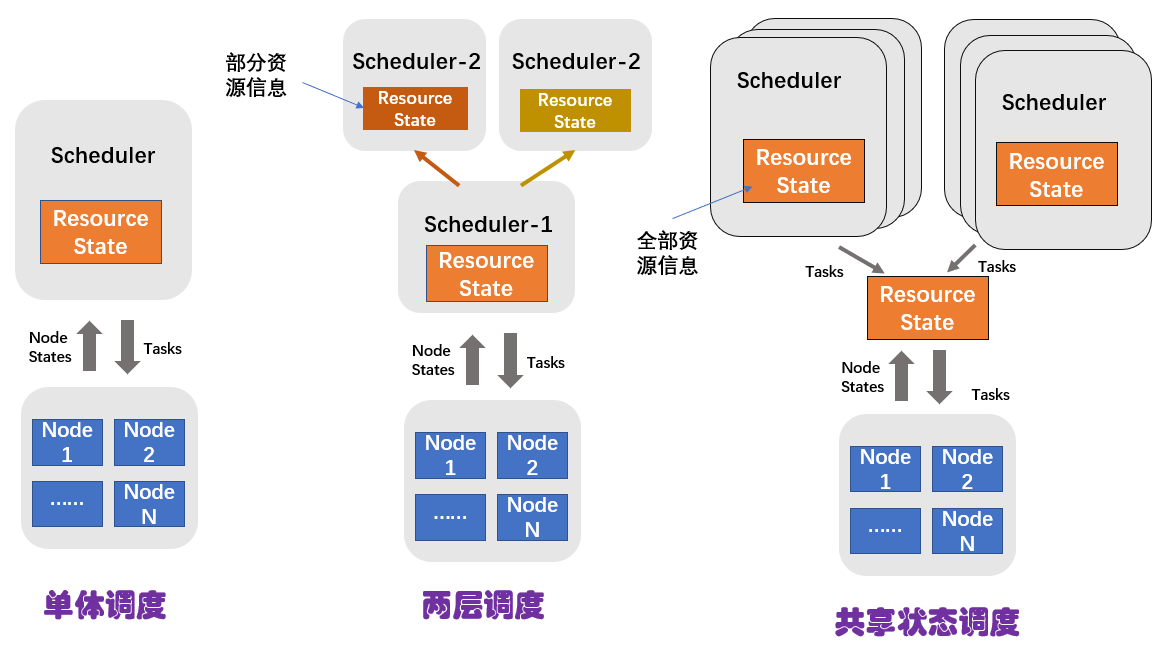 共享状态调度,多个调度器,每个调度器都可以看到集群的全局资源信息,并根据这些信息进行任务调度。相较于其他两个调度架构来说,共享状态调度架构适用的集群规模最大。