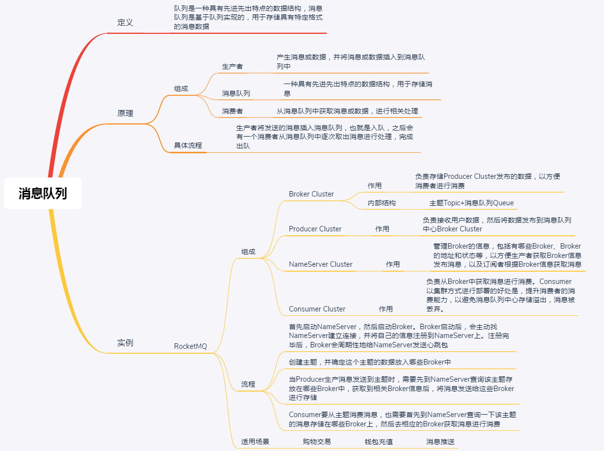 然后,我与你介绍了消息队列的基本原理,并以RocketMQ为例对其架构、核心组件和工作原理做了更深入的讲解,以帮助你进一步了解消息队列模型。