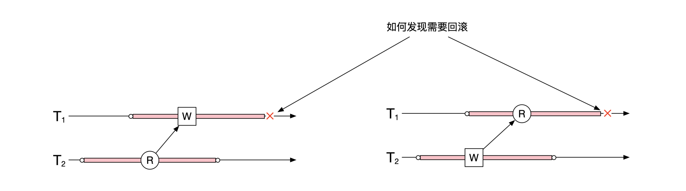 第一种情况是上图左边的情况。这时候数据库需要知道T1的写入操作会影响哪些还没有结束的事务。数据库需要保留读的信息。