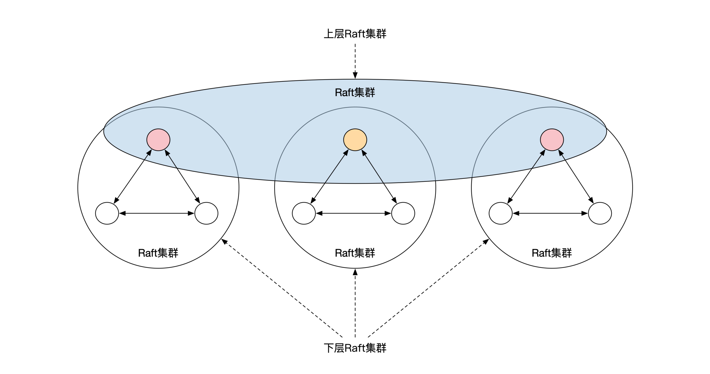 三地九中心并不是直接部署9个Raft节点,而是将Raft节点分为了两层。下面一层按照3个一组分为了3组,分别放在3个数据中心。每个数据中心的3个节点刚好组成一个Raft集群,通过Raft选主的方式选出来一个主节点。