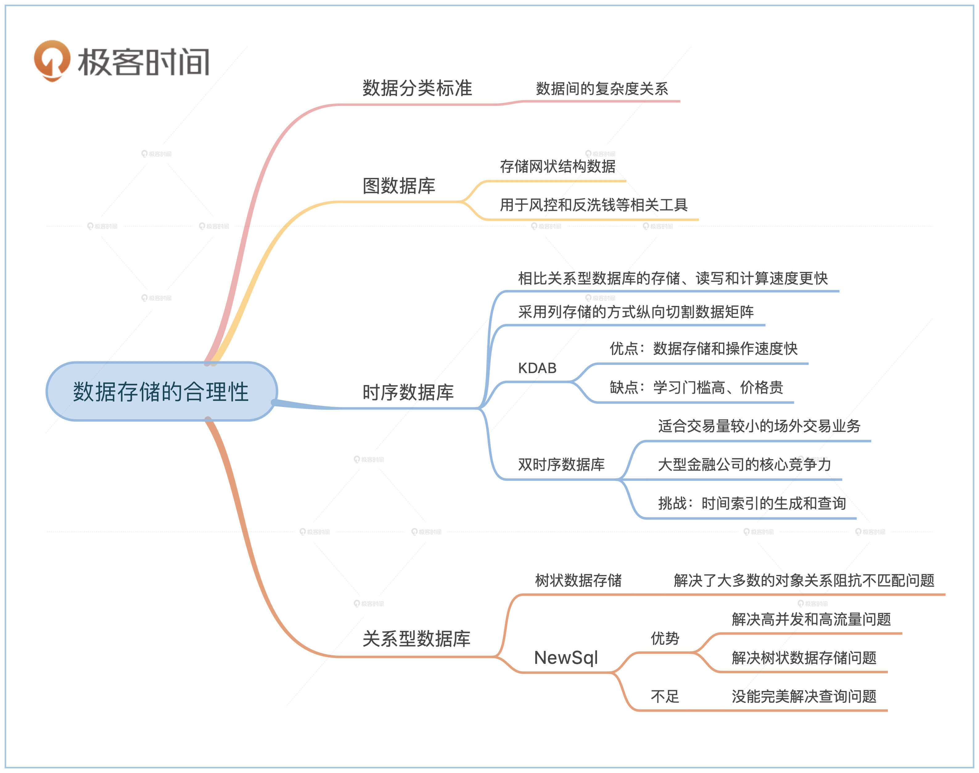 在选择存储类型前先要对数据类型分类。按照数据之间关系的复杂度,我们可以把金融数据分为图数据类型、没有关系的数据类型和树状数据类型,它们分别对应了图数据库、时序数据库和关系型数据库。