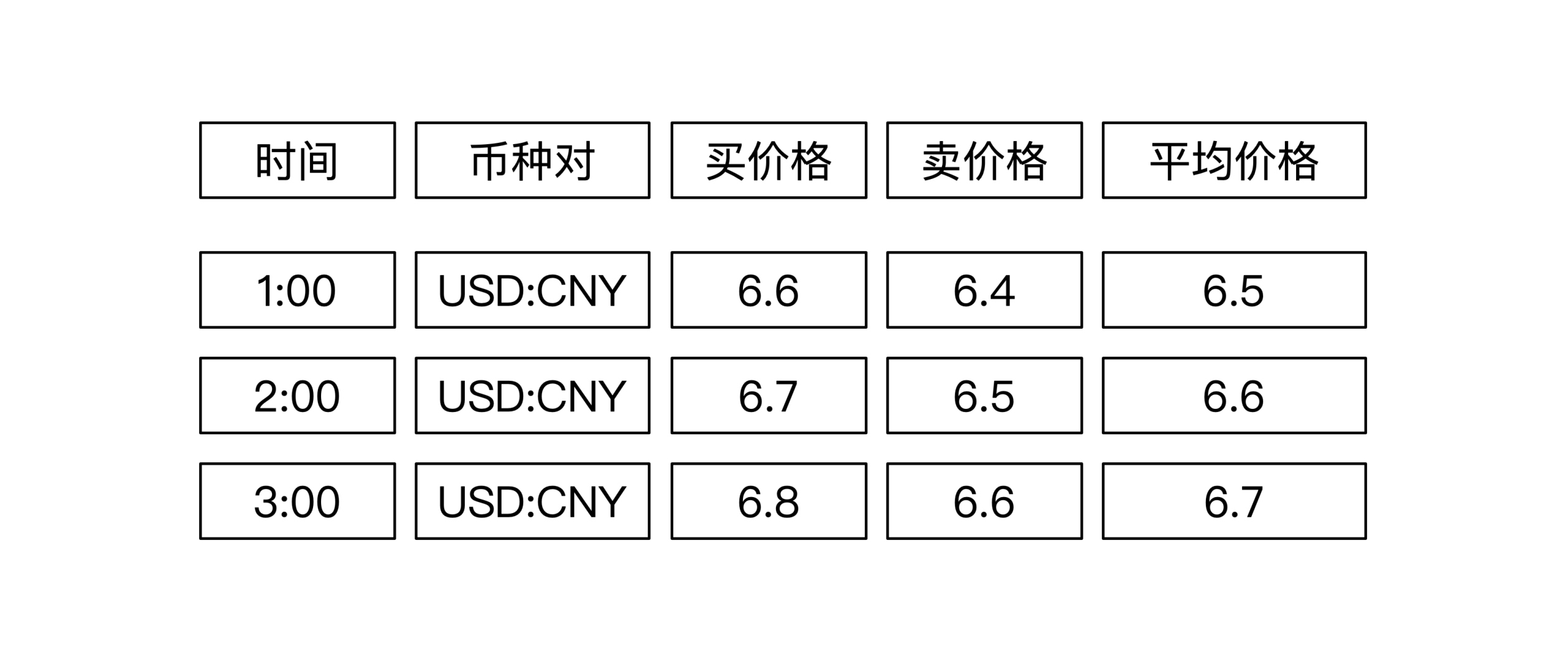 举个例子。假设你要存储外汇信息,那至少需要处理这些数据:时间、汇率币种、买价格、卖价格和平均价格。下面这幅图展示了连续3个时间点的外汇信息: