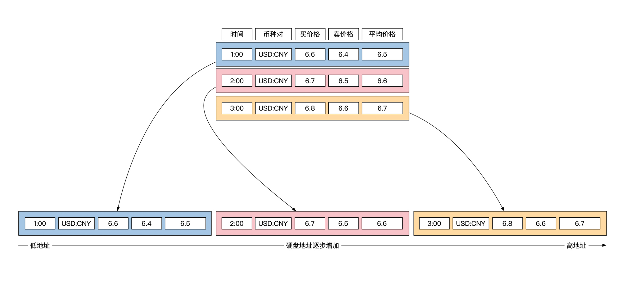 就像下面这幅图展示的存储方式一样,外汇信息被分为3个单位存储,每一行是一个单位: