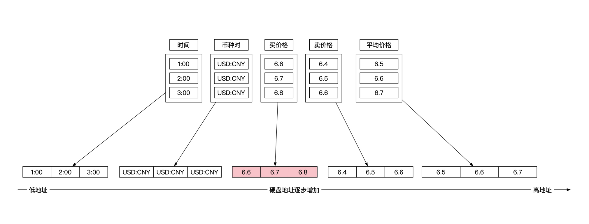 这时候你再想计算这3个时间点对应的买入价格的平均值,只需要加载上面这幅图粉红色的部分就可以了。由于大部分数据都不需加载到内存,这样就能节省大量的读取时间。很显然,对于金融市场数据来说,时序数据库是一种更加有效的存取方式。